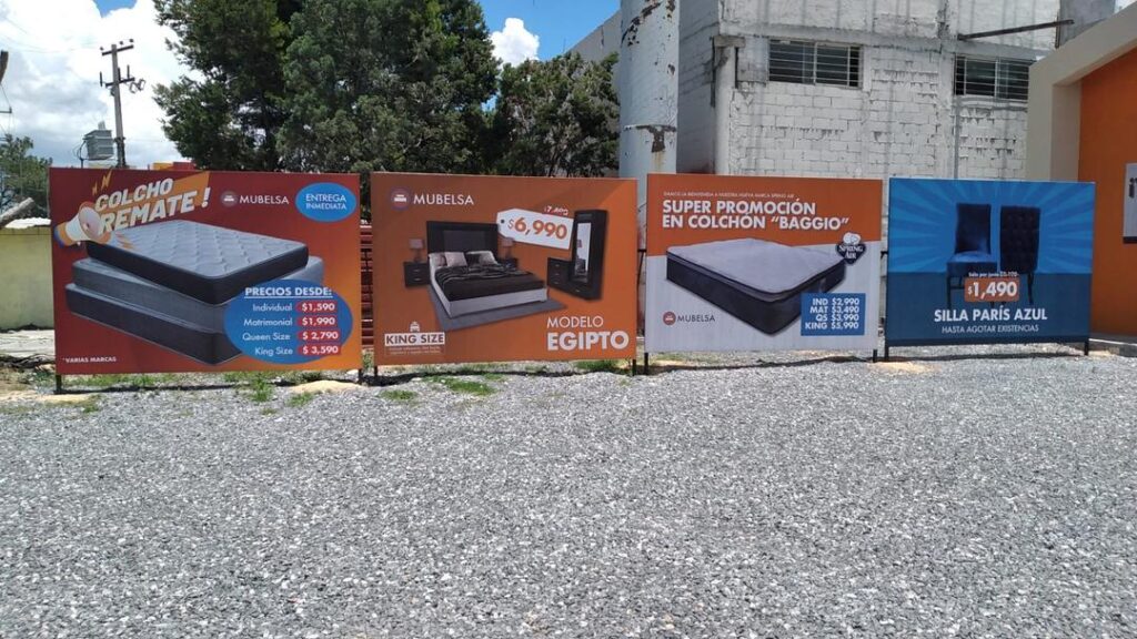 El fin de este trabajo es poder cambiar una o más lonas según se requiera, y se hizo de este tamaño (es más ancho, en total, que un espectacular) porque la mueblería está en la salida de una curva, y se necesitaba poder llamar efectivamente la atención de quienes pasaban manejando.